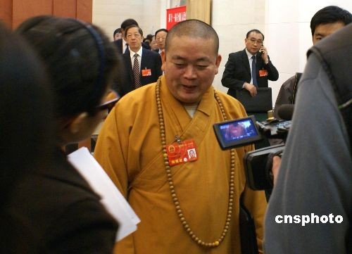 三月六日上午,河南代表團全體會議在北京人民大會堂召開,人大代表、嵩山少林寺方丈釋永信大師頻頻被媒體記者圍訪。圖為會議結(jié)束后,記者截住大師連連發(fā)問。中新社發(fā) 史寶銀 攝