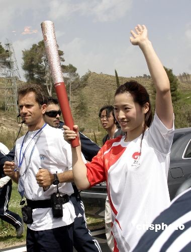 希臘當(dāng)?shù)貢r(shí)間3月24日,北京二00八年奧運(yùn)會(huì)圣火采集儀式在古奧林匹亞競(jìng)技場(chǎng)舉行,隨后火炬希臘傳遞開(kāi)始。第一位中國(guó)火炬手羅雪娟一邊傳遞圣火一邊向觀眾揮手致意。中新社發(fā) 王歡 攝