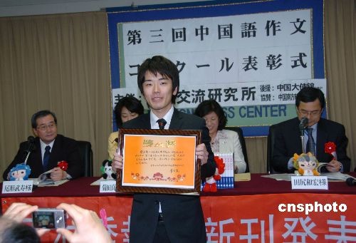 東京外國語大學(xué)三年級學(xué)生新保隆之從留學(xué)中國一年的體驗(yàn)談北京奧運(yùn)的作文受到高度評價,獲得中國駐日大使崔天凱簽名的最優(yōu)秀獎。中新社發(fā) 段躍中 攝