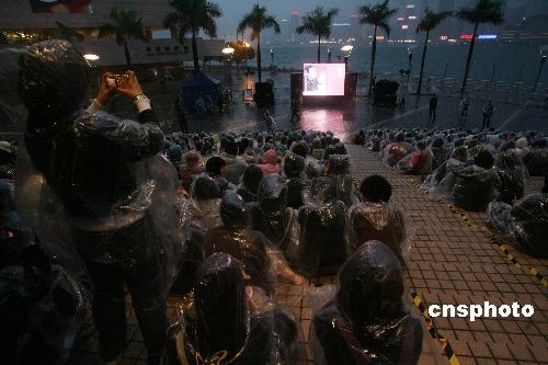 圖為觀眾在雨中觀看影片。中新社發(fā) 武仲林 攝