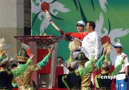 4月2日,北京奧運(yùn)會(huì)的火炬?zhèn)鬟f于中午12時(shí)從阿拉木圖麥迪奧山大壩出發(fā),五個(gè)小時(shí)后在阿斯塔納廣場(chǎng)舉行慶典活動(dòng)。這是奧運(yùn)圣火首次來(lái)到哈薩克斯坦,當(dāng)?shù)貙?duì)圣火傳遞相當(dāng)重視。圖為當(dāng)天最后一位火炬手、2000年奧運(yùn)會(huì)拳擊冠軍葉爾馬罕·伊布拉莫夫用手中的火炬點(diǎn)燃圣火盤(pán)。這預(yù)示著北京奧運(yùn)圣火境外傳遞首站火炬?zhèn)鬟f落幕。 中新社發(fā) 沈晨 攝