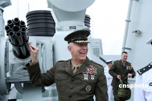 4月2日,美國海軍陸戰(zhàn)隊(duì)司令詹姆斯·康威上將一行開始對中國南海艦隊(duì)進(jìn)行為期2天的參觀訪問。南海艦隊(duì)副參謀長么志樓少將下午陪同康威上將前往湛江軍港,登上中國海軍“武漢”號導(dǎo)彈驅(qū)逐艦和“羅霄山”號登陸艦參觀。康威興致勃勃地參觀了艦艇指揮作戰(zhàn)室、駕駛室和艦載武器等核心部位,聽取了解說員對艦艇有關(guān)性能的介紹。康威對中國軍隊(duì)的開放程度、透明程度和現(xiàn)代化程度表示稱贊。圖為康威上將參觀“武漢”號導(dǎo)彈驅(qū)逐艦30炮,該軍艦是中國自行設(shè)計(jì)建造的新型現(xiàn)代化軍艦。中新社發(fā) 李唐 攝
