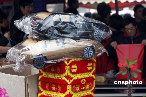 臺北民眾一早來到陽明山第一公墓祭拜祖先,制作精美的紙轎車祭品供亡者在天之靈有個現(xiàn)代的交通工具。中新社發(fā) 杜洋 攝
