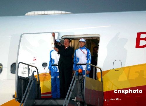 4月5日晚7時25分,載有北京奧運祥云圣火的“奧運圣火號”飛抵英國首都倫敦。倫敦人對圣火的到來極為重視,奧運事務(wù)大臣等重要官員悉數(shù)抵達(dá)機場迎接。圖為北京奧組委執(zhí)行副主席蔣效愚(中)手提圣火燈走下飛機。 中新社發(fā) 沈晨 攝