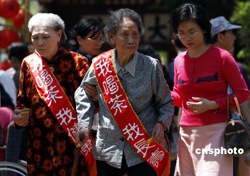 圖為臺(tái)灣茶協(xié)會(huì)理事長(zhǎng)圣輪法師101歲的老母親(中),出席活動(dòng)為“多多喝茶,健康多多”做宣傳。中新社發(fā) 杜洋 攝