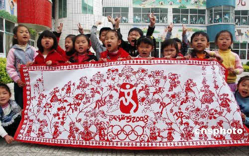 4月7日,幼兒園的小朋友在參觀《華夏兒女喜迎奧運圣火》剪紙作品。近日,河南周口軍分區(qū)幼兒園老師陳雪英用兩周的時間加班制作出了一幅《華夏兒女喜迎奧運圣火》的剪紙作品。據(jù)了解,該作品邊長2.3米,寬0.75米,畫面上刻有福娃、五環(huán)、火炬、和平鴿和各民族娃娃,整幅作品用國花牡丹連接而成,四周是一百多個火炬,象征著奧運圣火在全世界巡回傳遞,整幅作品表達(dá)了華夏各族兒女喜迎奧運圣火的歡樂情景。中新社發(fā) 楊正華 攝