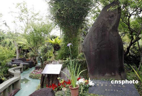 后園內(nèi)豎有一塊狀似臺(tái)灣地圖的巨石,是大千先生客居美國(guó)洛杉磯時(shí)在海灘上發(fā)現(xiàn)的,視為珍寶,題刻“梅丘”。巨石腳下,有張群題刻的青石:“大千先生靈厝”,一代國(guó)畫(huà)大師即長(zhǎng)眠于此。中新社發(fā) 杜洋 攝
