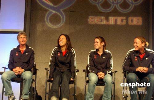 4月14日,兩次奪得奧運(yùn)金牌的美國(guó)女子足球隊(duì)主要成員在芝加哥美國(guó)奧運(yùn)代表團(tuán)新聞峰會(huì)上表示,北京奧運(yùn)會(huì)的主要目標(biāo)是奪冠。圖為去年年底剛上任的美國(guó)女足主教練皮亞(左一),前鋒凱特·馬克格拉芙(左二),后衛(wèi)奧雷利(右二)、前鋒阿比·邁巴赫(右一)。 作者: 李靜