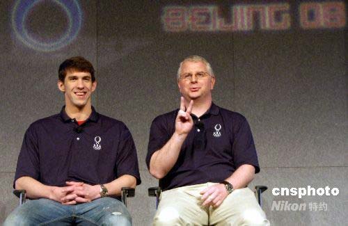 4月14日,美國泳壇“神童”菲爾普斯(左)在芝加哥表示,他在北京奧運會的目標(biāo)是贏得所有參賽項目的冠軍。他的教練鮑伯·褒曼透露,過去4年中菲爾普斯已經(jīng)在體能和蛙泳兩方面有很大進(jìn)步。作者: 李靜