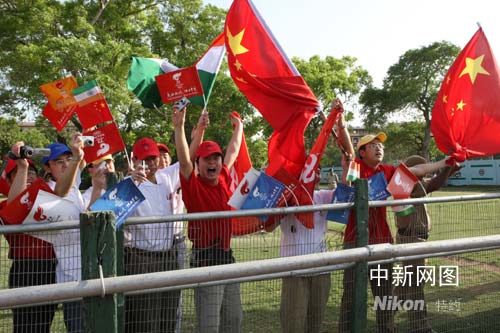 4月17日凌晨0時55分,北京奧運圣火抵達印度首都新德里,拉開了北京奧運圣火“和諧之旅”第十一站的序幕。從17日下午4時起,傳遞活動將在新德里印度總統(tǒng)府和印度門之間的拉吉大街上進行。70名火炬手將沿著這條三公里長的大街傳遞圣火。圖為印度華人華僑在歡迎北京奧運圣火。中新社發(fā) 沈晨 攝