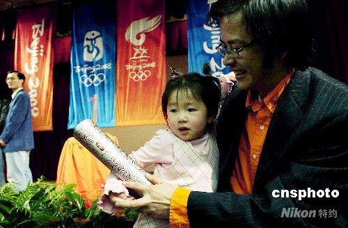 當(dāng)?shù)貢r(shí)間四月十八日,舊金山華人華僑喜見(jiàn)北京奧運(yùn)祥云火炬。圖為一對(duì)父女在仔細(xì)端詳火炬。 陳鋼 攝