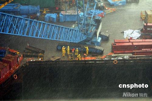 在會展中心擴建工地上施工人員冒雨工作。中新社發(fā) 洪少葵 攝