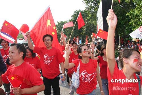 圖為中國(guó)留學(xué)生高舉國(guó)旗經(jīng)過曼谷市民族紀(jì)念碑時(shí)高呼:“北京奧運(yùn)一定成功!中國(guó)加油!。 顧時(shí)宏 攝
