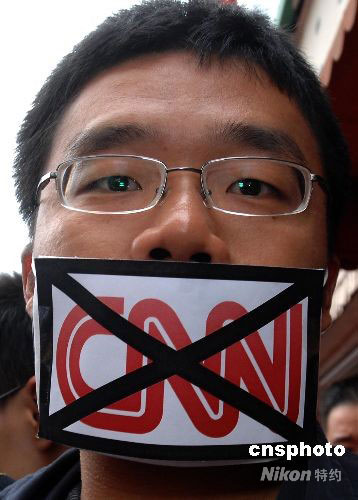 當(dāng)?shù)貢r間4月19日上午,洛杉磯當(dāng)天爆發(fā)十幾年來最大規(guī)模的華人華僑抗議示威活動。數(shù)千名華人華僑和留學(xué)生在CNN洛杉磯分部門前參加和平示威,要求CNN向公開鄭重道歉,并開除卡弗蒂。圖為一名抗議者戴著抗議CNN的口罩參加示威活動。中新社發(fā) 張煒 攝
