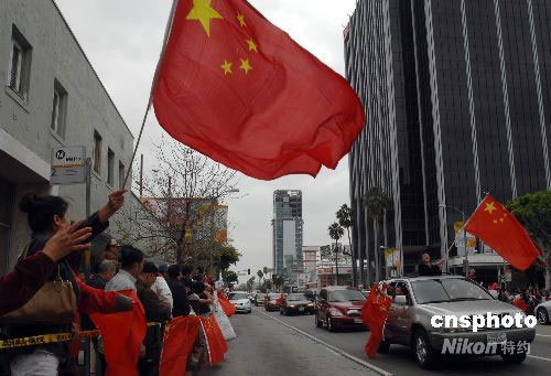 當?shù)貢r間4月19日,洛杉磯爆發(fā)十幾年來最大規(guī)模的華人華僑抗議示威活動。數(shù)千名華人華僑和留學生在CNN洛杉磯分部門前參加和平示威,要求CNN向公開鄭重道歉,并開除卡弗蒂。圖為抗議者駕車揮舞五星紅旗。中新社發(fā) 張煒 攝