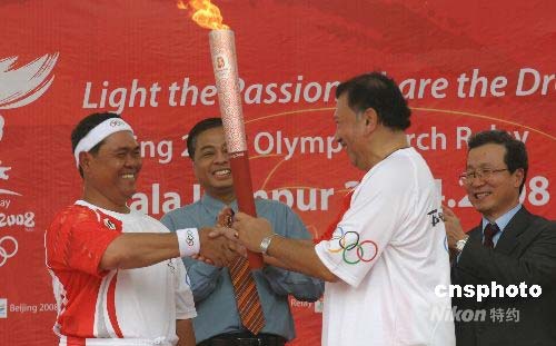 圖為第一棒火炬手、馬來(lái)西亞奧委會(huì)主席東姑伊姆拉(右)從吉隆坡市市長(zhǎng)哈金手中接過(guò)第一棒火炬。作者: 沈晨
