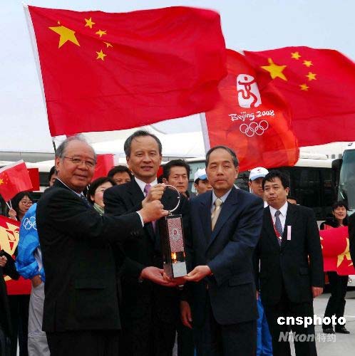 中國駐日大使崔天凱(中)到機場迎接奧運圣火抵達日本。