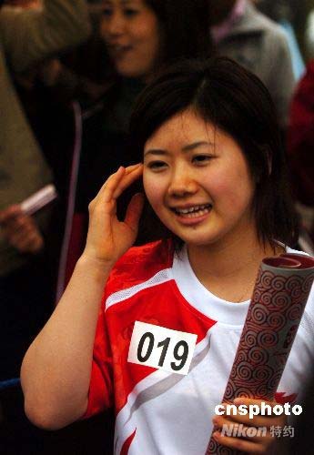 圖為日本著名乒乓球國手福原愛完成長野站第19棒火炬?zhèn)鬟f后露出欣喜表情。中新社發(fā) 朱沿華 攝