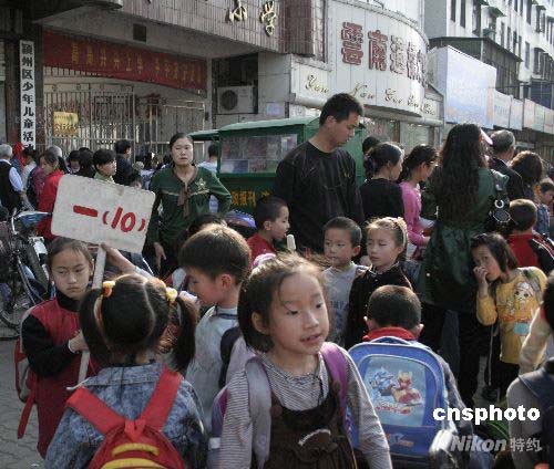四月二十八日下午,阜陽市清河路小學(xué)一年級學(xué)生在排隊放學(xué)。安徽省阜陽市千余嬰幼兒童感染腸道病毒EV71后,當(dāng)?shù)卣扇〈胧┘訌娋戎,?yán)守預(yù)防,減少擴延。中新社發(fā) 張婭子 攝