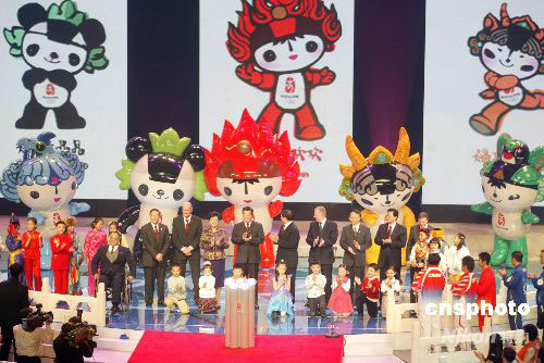 2005年11月11日晚,北京二零零八年奧運(yùn)會吉祥物發(fā)布暨倒計時一千天活動在北京工人體育館舉行,五個吉祥物福娃貝貝、福娃晶晶、福娃歡歡、福娃迎迎、福娃妮妮隆重登場。作者:盛佳鵬