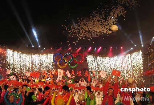 演員和觀眾振臂歡呼,臺上臺下焰火輝映,共同期待一百天后的北京奧運(yùn)盛會。 中新社發(fā) 潘海濤 攝