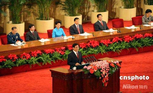 北京奧組委主席在奧運(yùn)會(huì)倒計(jì)時(shí)100天誓師大會(huì)上致辭。中新社發(fā) 任海霞 攝