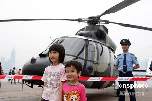 圖為市民在昂船洲軍營與軍用直升機合影。中新社發(fā) 武仲林 攝