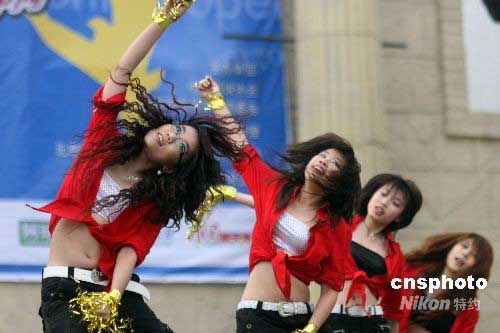 2008年“五一”期間, 2008“中網(wǎng)·網(wǎng)動(dòng)中國(guó)”網(wǎng)球拉拉隊(duì)團(tuán)體復(fù)賽在北京歡樂(lè)谷舉行。來(lái)自北京十幾所高校的拉拉隊(duì)選手參加了比賽,進(jìn)入前三名的選手將取得2008中國(guó)網(wǎng)球公開(kāi)賽拉拉隊(duì)的資格。中新社發(fā) 陳曉根 攝