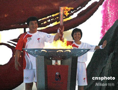 圖:成龍與三亞女鎮(zhèn)長(zhǎng)共同點(diǎn)燃三亞圣火盆 (2)