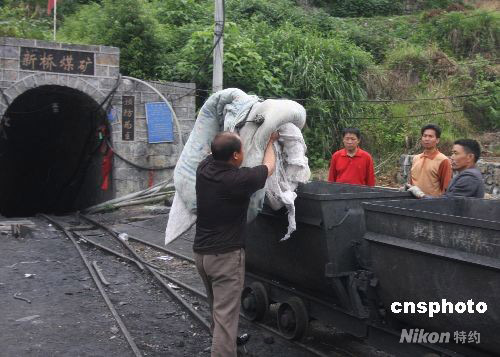 搶險隊員準(zhǔn)備搶險物質(zhì)到發(fā)生煤與瓦斯突出事故的漣源市安平鎮(zhèn)新橋煤礦進(jìn)行搶救。中新社發(fā) 郭國權(quán) 攝