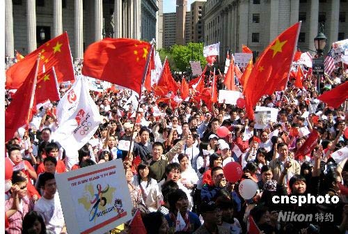 5月4日,紐約地區(qū)的華人華僑、留學(xué)生在曼哈頓弗利廣場舉行聲勢浩大的“和平奧運(yùn)”集會(huì),約萬人參加了當(dāng)天的集會(huì)活動(dòng)。中新社發(fā) 鄧悅 攝