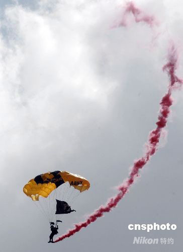 圖為美軍“金騎士”跳傘隊表演“云中漫步”。中新社發(fā) 張煒 攝