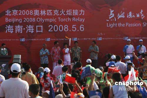 5月6日,北京奧運(yùn)圣火在?谑袀鬟f。圖為第一棒火炬手王麗芳向觀眾展示奧運(yùn)圣火。中新社發(fā) 尹海明 攝