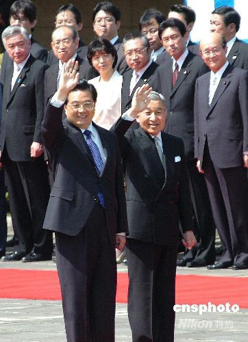 圖為胡錦濤和明仁天皇向歡迎人群揮手。