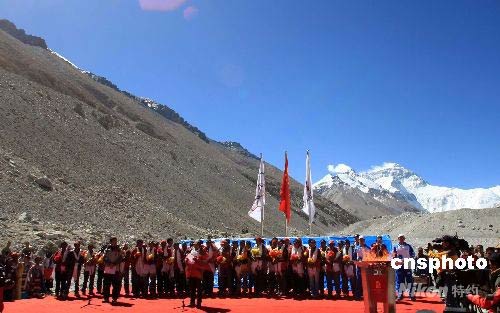 北京奧運(yùn)火炬接力珠峰傳遞中國登山隊凱旋慶祝儀式在珠峰大本營舉行。中新社發(fā) 盛佳鵬 攝