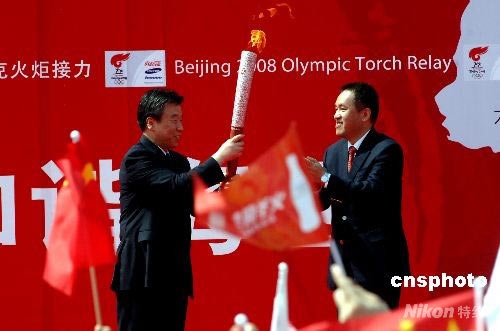 5月11日上午9點(diǎn)40分左右,北京奧運(yùn)會火炬接力境內(nèi)福建福州站起跑儀式在福州五一廣場隆重舉行。圖為中共福建省委書記盧展工(左)從北京奧組委官員張矛手中接過火炬。