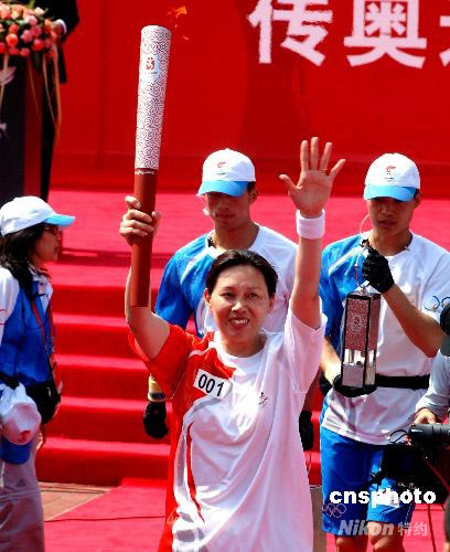 福建籍的奧運(yùn)冠軍、中國(guó)女排名將鄭美珠跑出奧運(yùn)圣火福建傳遞首站福州站的第一棒。中新社發(fā) 劉可耕 攝