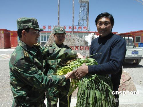 5月10日,青藏高原行車的中國(guó)汽車兵路過(guò)位于青海省可可西里國(guó)家自然保護(hù)區(qū)的索南達(dá)杰保護(hù)站,把新鮮的蔬菜和副食品送到工作人員手中。中新社發(fā) 吳蘇琳 攝
