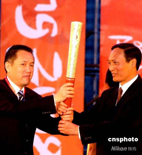 北京奧組委有關(guān)官員向中共福州市委書(shū)記袁榮祥(右)贈(zèng)送祥云火炬及證書(shū)。 中新社發(fā) 劉可耕 攝