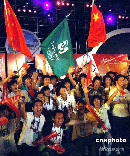 眾多福州青年在北京奧運會火炬接力境內(nèi)傳遞福建福州站慶典儀式上,激情飛揚歡慶奧運圣火福州成功傳遞。中新社發(fā) 劉可耕 攝