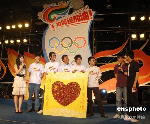 2008年5月11日,臺(tái)灣學(xué)子在展示為奧運(yùn)會(huì)創(chuàng)作的祝福禮物。當(dāng)日,為了慶祝北京奧運(yùn)會(huì)圣火在福州成功傳遞, 閩臺(tái)學(xué)子牽手兩岸共迎奧運(yùn)圣火活動(dòng)舉行。 中新社發(fā) 張 斌 攝