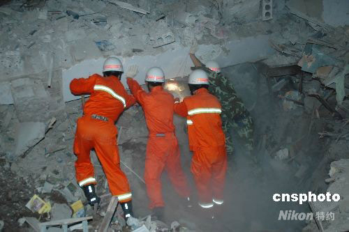 12日下午2:30左右,受四川汶川地震波及,重慶市梁平縣文化鎮(zhèn)一小學(xué)教學(xué)樓發(fā)生垮塌。13日凌晨1時(shí)許,搜救工作已全部結(jié)束,垮塌造成5人死亡,36人受傷。圖為消防隊(duì)員正在進(jìn)行搜救。 中新社發(fā) 郭虹 攝