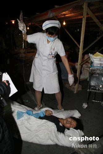 圖:醫(yī)務(wù)工作者救助來自都江堰地震傷員