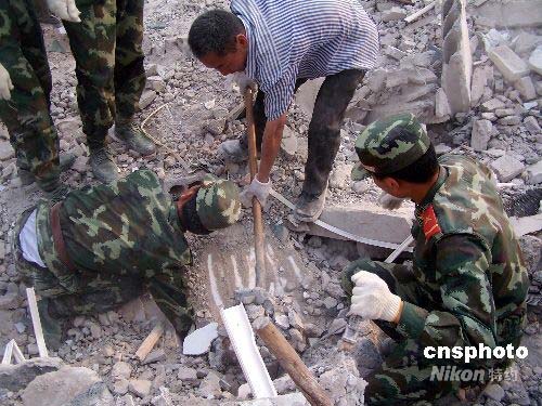 5月12日下午,四川汶川發(fā)生7.8級地震,導(dǎo)致重慶梁平縣文化鎮(zhèn)中心小學(xué)坍塌,武警重慶總隊梁平縣中隊官兵在中隊指導(dǎo)員唐兵的帶領(lǐng)下緊急趕赴現(xiàn)場展開搜救。經(jīng)過官兵們連續(xù)6個小時的艱苦奮戰(zhàn),從廢墟中成功救出11名師生。(李剛、陳萬金、秦龍兵攝影報道)