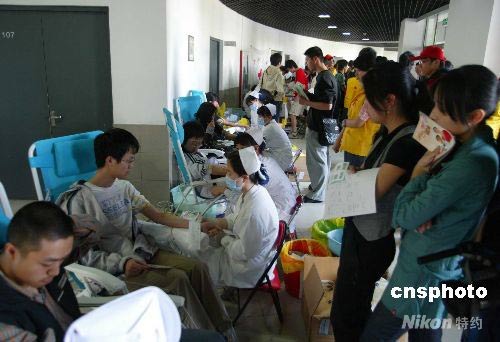 5月13日,清華大學紅十字會提出了“真情流淌 血脈相通”為汶川災區(qū)緊急獻血的倡議,學子們踴躍參與。