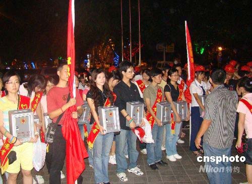 5月13日晚上八點(diǎn),由海南青年志愿者協(xié)會(huì)、省紅十會(huì)、志愿海南愛(ài)心分社和海南電視臺(tái)《鷯哥》欄目組織30多位自愿者,走上街頭為四川地震災(zāi)區(qū)募捐善款。圖務(wù)志愿者作出發(fā)募捐前的準(zhǔn)備。中新社發(fā) 付美斌 攝