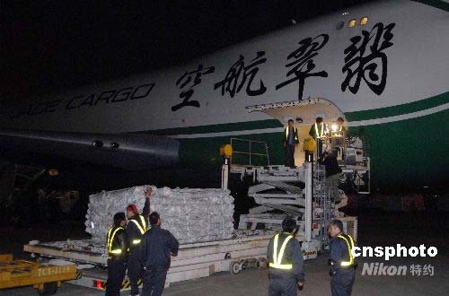 五月十三日深夜,深圳航空旗下的中德合資翡翠航空大型貨機(jī)JI7452受命緊急運(yùn)輸救災(zāi)物資,四千頂帳篷從天津?yàn)I海機(jī)場(chǎng)連夜裝機(jī)起運(yùn),專(zhuān)機(jī)運(yùn)往四川地震災(zāi)區(qū)。中新社發(fā) 陳文 攝