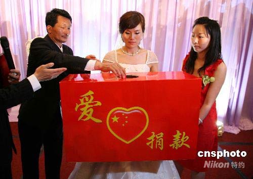 新娘邱媛媛和新郎饒新的家人在婚禮現(xiàn)場向四川災(zāi)區(qū)捐贈2萬元人民幣。中新社發(fā) 鐘山 攝