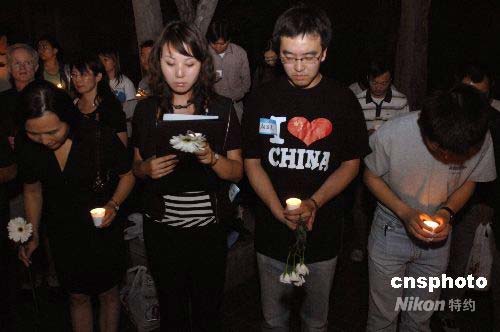 當?shù)貢r間五月十六日晚,洛杉磯中國留學生和學者等兩百多人在加州大學洛杉磯分校舉行燭光追思會,悼念四川大地震死難同胞,并向災區(qū)捐獻愛心。中新社發(fā) 張煒 攝