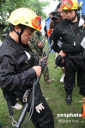 圖為救援隊員在調(diào)試視像探測器。中新社發(fā) 齊彬 攝